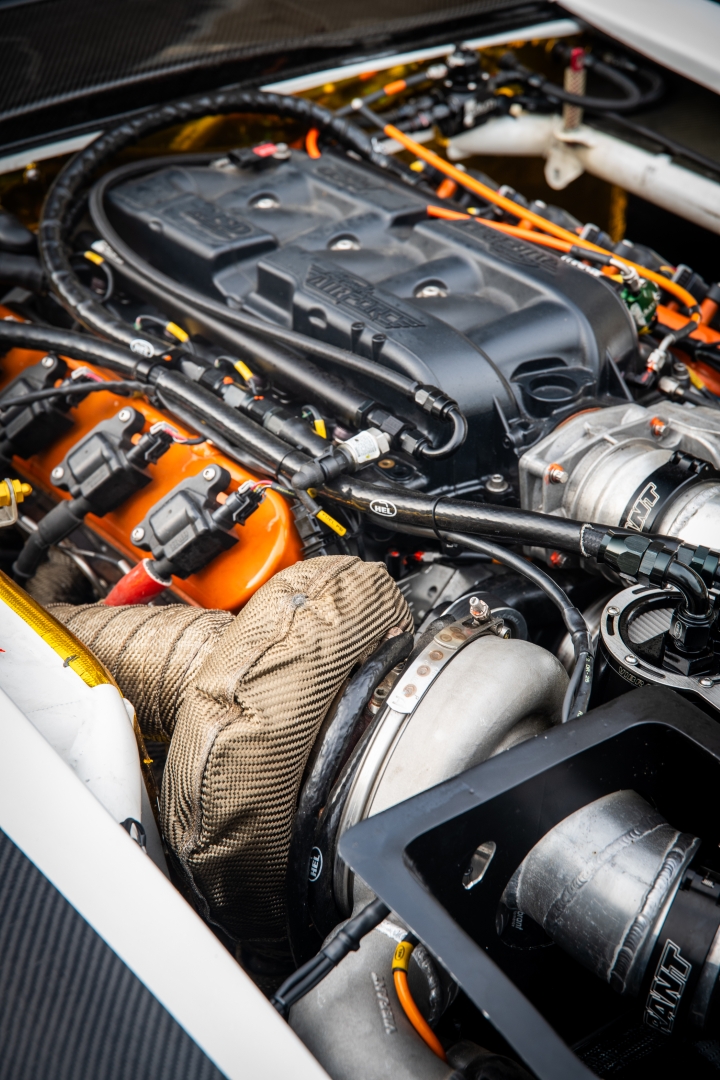 Power comes from a Texas Speed–built 427 LS, force-fed by a compact Garrett G42-1200 turbo. The combination is good for 850 horsepower, which is plenty for such a lightweight chassis. Even with a tight engine bay, the routing looks intentional thanks to Vibrant components, fabricated pipes, and some custom turbo plumbing. A Dailey dry sump setup keeps oiling reliable under race conditions, and Radium Engineering manages the fuel delivery demands cleanly. Cooling is handled by a ducted front end paired with CSF components, because climbing a mountain of thinning air at pace isn’t exactly gentle on intake temps.