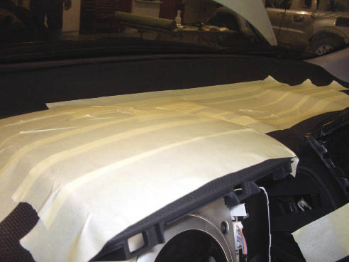 The first step was to pull a mold of the area the gauges were going to be located in. We decided to locate three of the gauges directly above the factory gauge cluster and the other three above the radio. This required the tape and foil the entire top of the dash along with the windshield and floor board. When working on any car you can’t be to careful.
