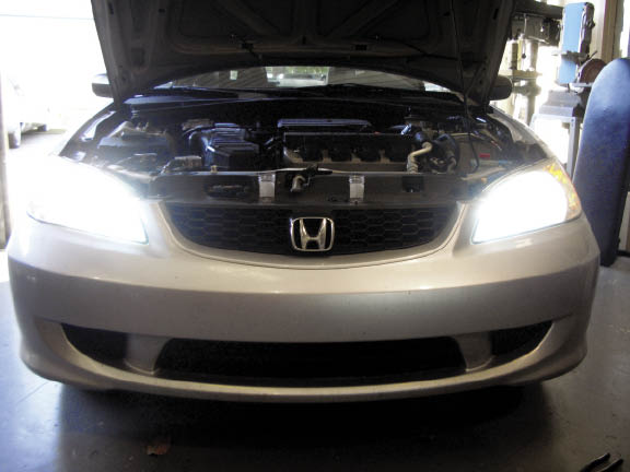 With the battery out of the way the factory bulbs were removed and the HID ballast and bulbs were prepped for installation. Because the HID kit was specific to the Civic everything was plug ‘n’ play. Be sure when you are connecting the HID plug to the factory plug you push the connector in all the way. Also, use caution when inserting the new HID bulb into the headlight.