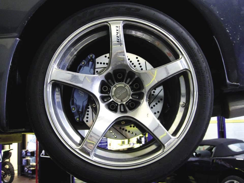 monster rears, we hope to dip below 110 and with fresh H8 Track compound pads are aiming for sub-100! We started by contacting Lee Takagi, General Manager of Rotora USA about a rear system for the car. Takagi suggested we go with the 4-piston / 330mm kit complete with lines and some H2 compound street / track pads.