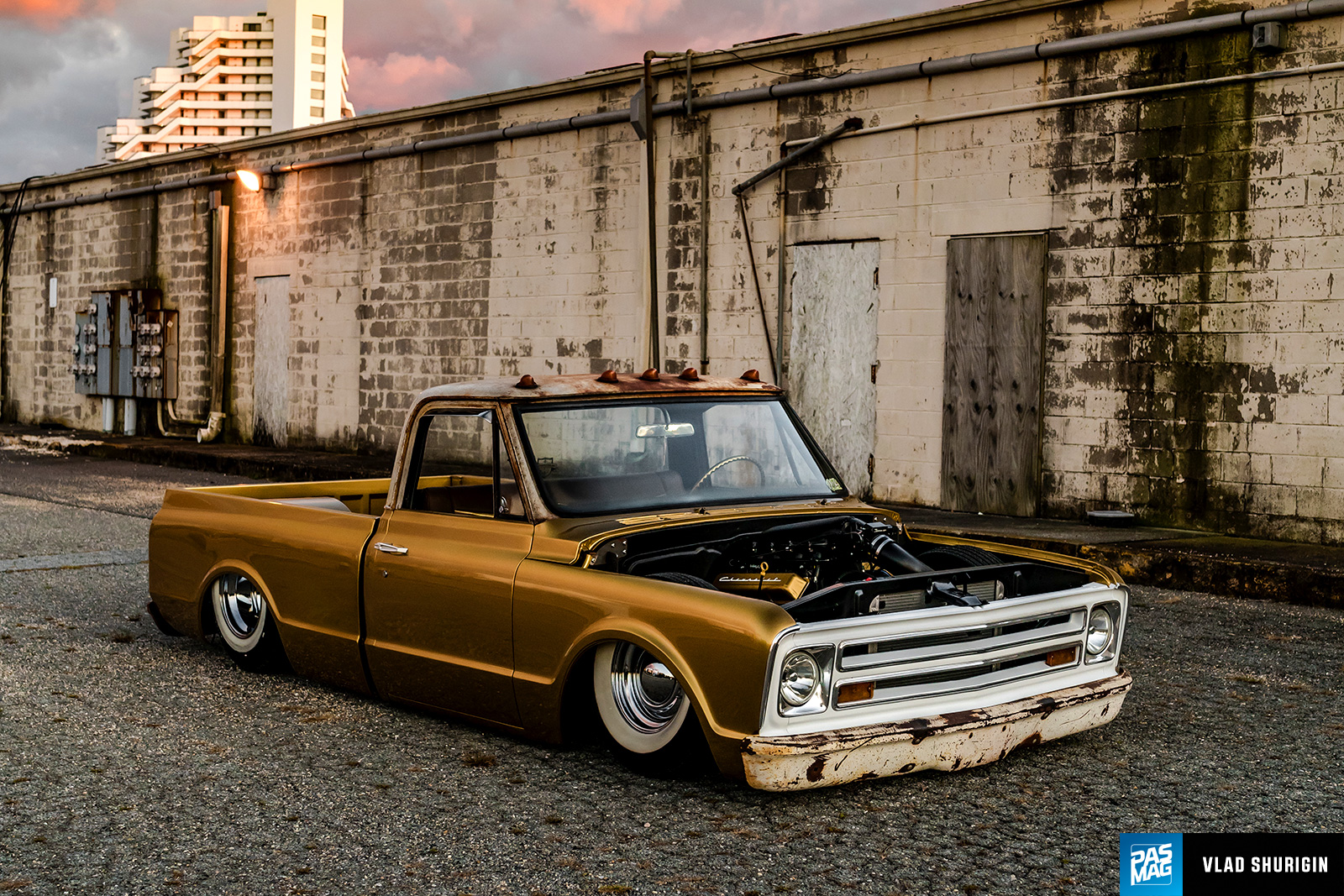 Speaking of which, power isn’t the only thing this truck puts to the ground. With the touch of a button, Begley can lay frame thanks to his Airlift Performance air suspension system. To help get this 50-plus-year-old truck become grounded, Begley enlisted some Michigan Metal Works front control arms, complete with better ball joint angles, and even completely rebuilt the rear suspension to a four-link setup at his hot rod shop: Renegade Hot Rods. This is also where Begley chopped middle and rear sections of the frame to convert the once long-boxed truck to a short-box version and did every bit of wrench turning on his truck. Now, the C-10’s freshly-painted golden body (sans patina’d roof, pillars, and bumpers) airs out over a classic combination of 15-inch Cragar Smoothies wrapped up in Firestone white wall tires from Coker.
