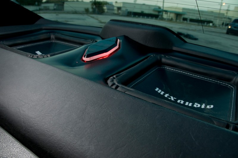 The sinister MTX theme carried on into the interior where loads of reupholstered components are found. A black suede headliner, armrests and various accents accent the black leather with red woven leather seats. Over 70 trim panels were pulled out and refinished with a menacing dark theme. The door panels were pulled and feature the same red woven leather with custom red LED back-lit Plexiglas. The interior treatment set the stage for where MTX would put forth all of their effort – the audio assault.