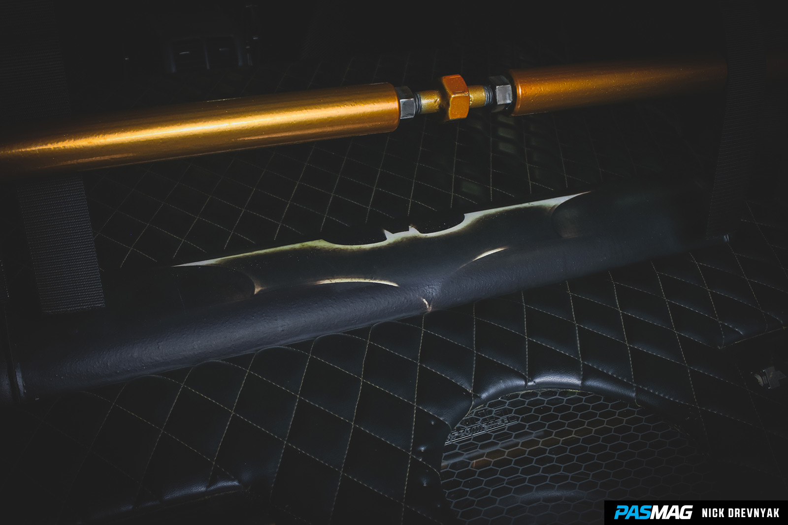 Under the hood, the valve cover and takes on some gold accents, while inside, the Forge Motorsport Big Knob shift knob, harness bar, air system hardlines and honeycomb inserts receive a touch of gold. The NRG steering wheel, shift and e-brake boots, as well as the Cobra racing seats were all stitched with the same gold to tie everything together. In the rear of the car, just above the air management system, is an illuminated Batman symbol to really drive the point home.