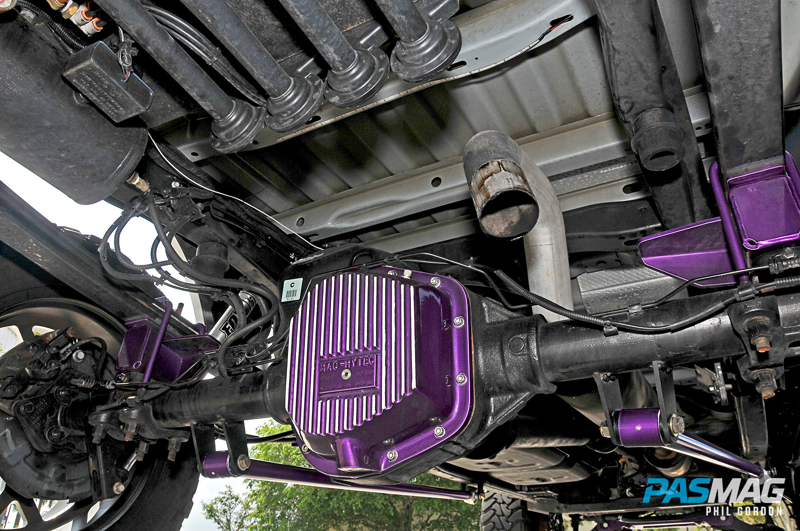 “I’ve wanted to do white and purple,” Mallory says of her color scheme. You might be asking, ‘Where’s the purple?’, but look closer and you’ll find it on the Smittybilt M1 grille, Fabtech anodized upper control arms, coils, traction bars, tow bar, and Magnitech diff cover. Heck, even the inlet tube from the K&N filter has been given the royal treatment. Just don’t get too close, or the HornBlasters Shocker Train Horn kit may blow your ears off.