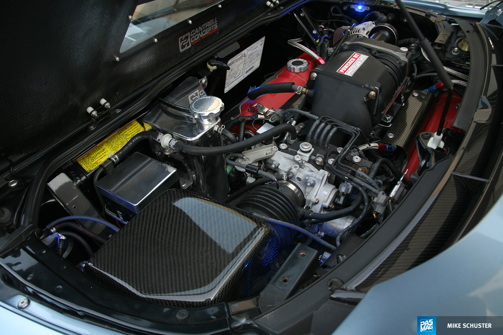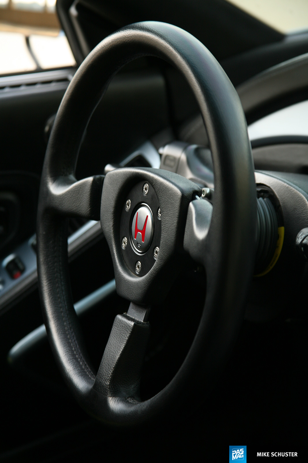 When it came to landing gear Warnick wanted to run with something dramatic. The wider fenders meant more offset and more lip when he went shopping for Volk Racing GT-Cs. He settled on 18x8 in the front with 19x10.5 in the back, wearing Bridgestone Potenza S03s in 255/35R18 and 285/30R19. Poking though the spokes is a complete Brembo GT braking system with 4-piston/328mm all around. And the suspension was upgraded with TEIN Type RA coilovers and CompTech sway bars to keep it planted. Science of Speed rapid non compliance toe links and rear beam bushings were added to improve stability. Then more parts borrowed from the Honda NSX including an upper and front chassis reinforcement bar were added for chassis strength.
