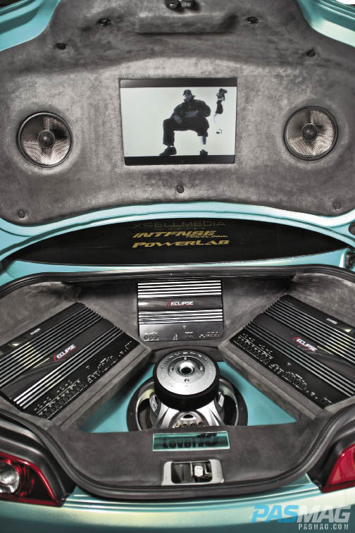 The low hard-hitting notes fed into a XA1000 mono and a single SW7200 12-inch sub in the trunk. Eclipse loaded up the extras including: side-view camera, back-up camera, iPod adapter, Bluetooth adapter and a Sirius satellite radio module.