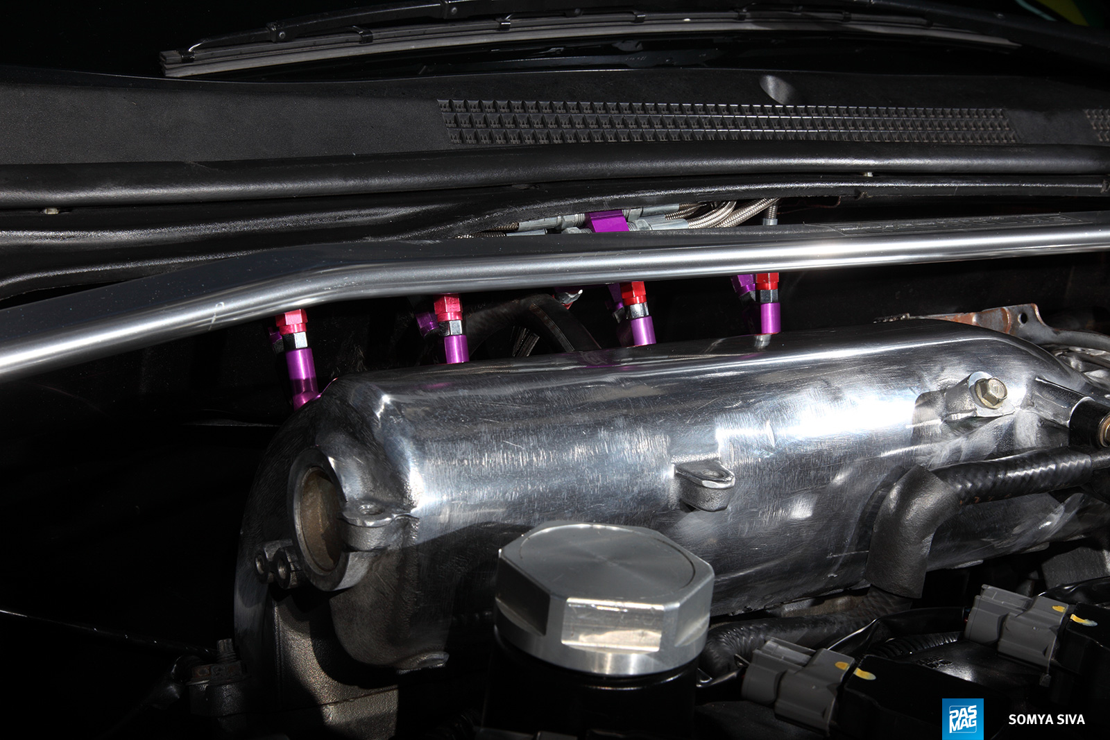 A set of K-Sport Kontrol coilovers were added for all the dampening and ride-height adjustments the car would need. The Suspension Techniques sway bars eliminate the roll while the Racingline end-links keep the sways in check. Some Racingline strut bars cinch the chassis together and many of the OE suspension parts are either chromed or polished.