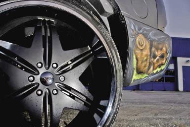 The shell was taken to Xtreme Auto Body to receive the touch of bodywork magic from Frank Padillo. After the exterior was hit in flat black it was taken to Devil’s Candy Customs. Shop owner Brain Boan took his time airbrushing several accents to the car to set it off. The headlights and taillights were blacked out and fitted with Xenonworx HIDs and LEDs. The stock wheels were pulled to make way for MÖZ Tower-6 wheels that measure a shocking 26x10-inches. The sinister satin black wheels were wrapped with 305/30R26 Pirelli Scorpion Zeros to keep the Escalade connected to the blacktop.