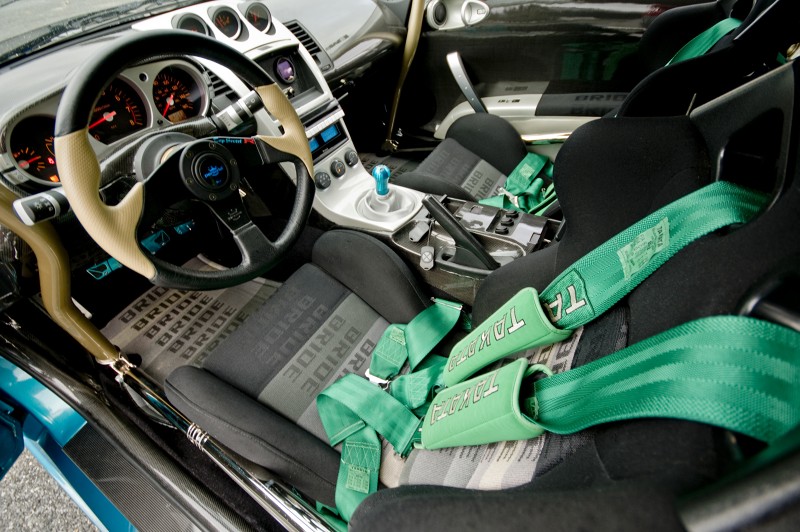 The classic Volk Racing FS Challenge forged alloys were selected with 19 x 9.5-inch fronts and 19 x 10.5-inch rears boasting a -9 offset. The Dunlop Direzzas cloaking the wheels are 245/35R19s for steering inputs and 275/30R19s to put down the power. Lurking behind the trademark 5-spokes are a set of Project Mu’s finest SCR-pro 14-inch slotted rotors gripped by 6-piston calipers up front with a 13-inch/4-piston combo in the rear.