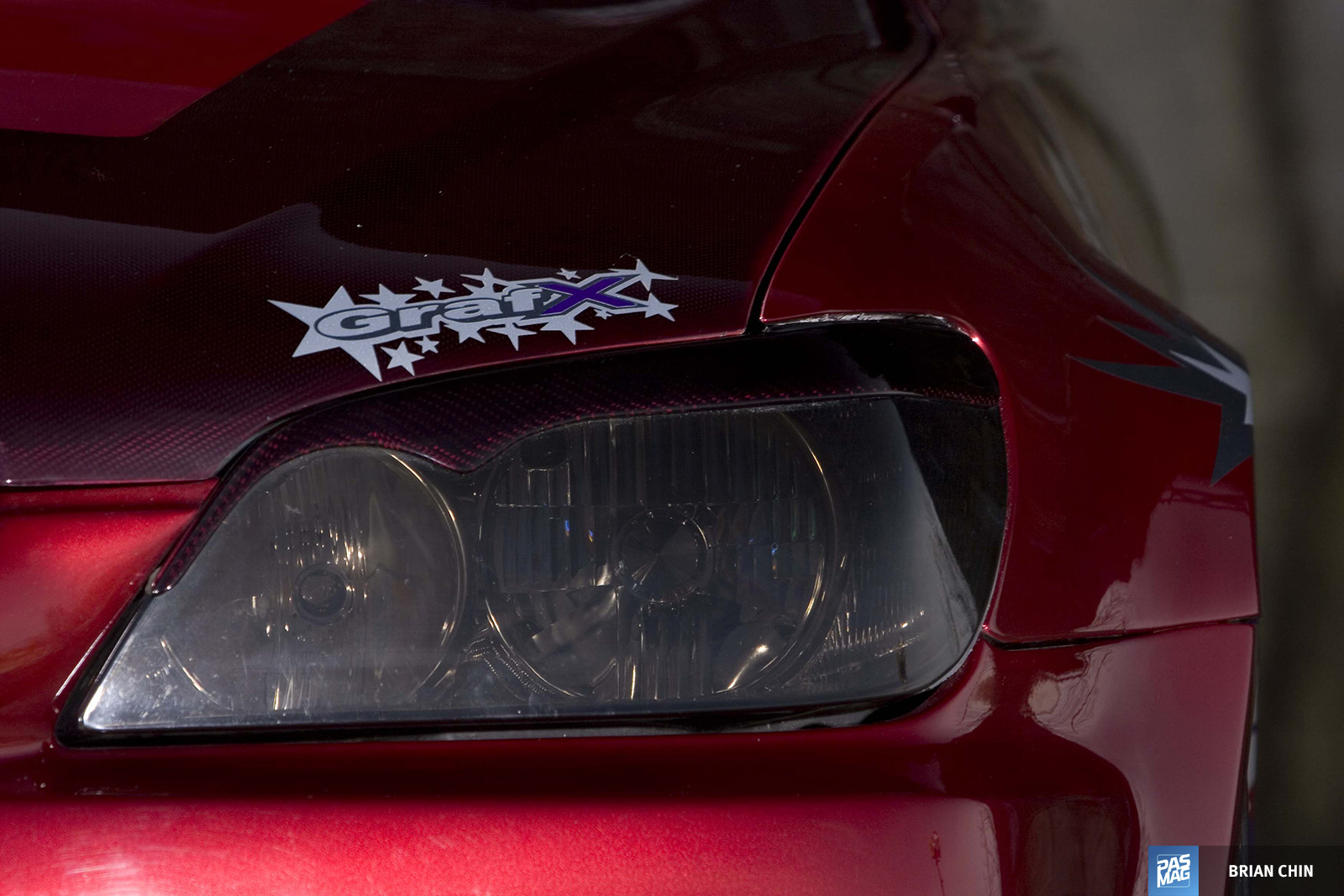 The overall presence of the car is one that we just couldn’t ignore. This eye-grabbing sedan seduces the crowds, yet incorporates enough racing accents to alert others that there is excess muscle ready to flex. The front fascia is updated with and Elixir bumper to match the Elixir carbon fiber hood atop the Rod Millen grille. The sideskirts are a C-West design as is the rear bumper. The Wald front fenders are vented with and increased width of a few millimetres. On the rear deck lid sits a rare TRD carbon fiber wing above genuine JDM Altezza tails. The front headlights are also from the JDM Altezza IS200 but powered by a yellow 3700K HID kit from M-TEC. Aside from having custom shaved trim and door handles the most striking feature of Ramnarain’s IS is on the roof. Or rather, is the roof which was cut out to make way for a carbon fiber skin. The weight savings is always welcome but it is a huge job that should only be attempted by pros. The project was coated in several layers of House of Kolor Kandy Brandy Wine.