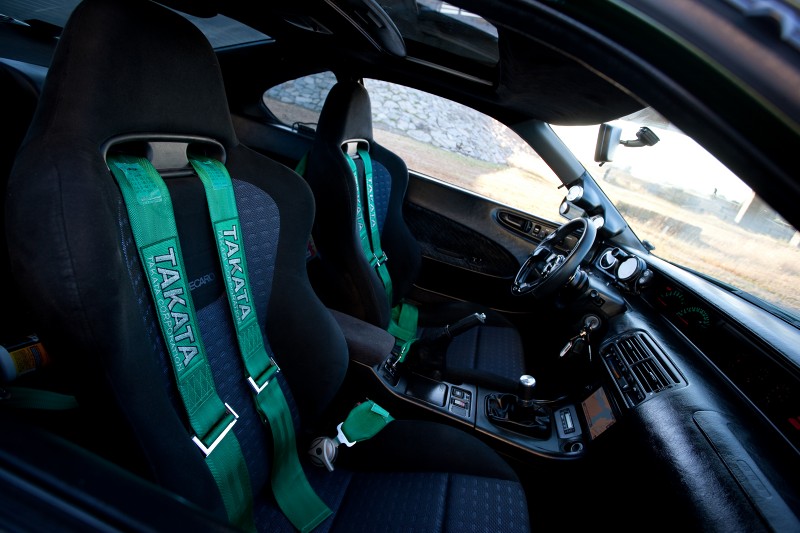 The rollers also have that period look with a classic set of Volks. The GT-7 wheel measures 17x8-inches all around and rocks a Falken FK452 215/40R17 on all four corners. The proper stance was achieved using TEIN FLEX coilovers and an SPC camber kit to dial-in the camber. Behind the front spokes are a set of Spoon Sports 4-piston brakes clamping 12-inch rotors. The balance of the system remains OE but now uses Hawk HPS pads and Goodridge SS lines.
