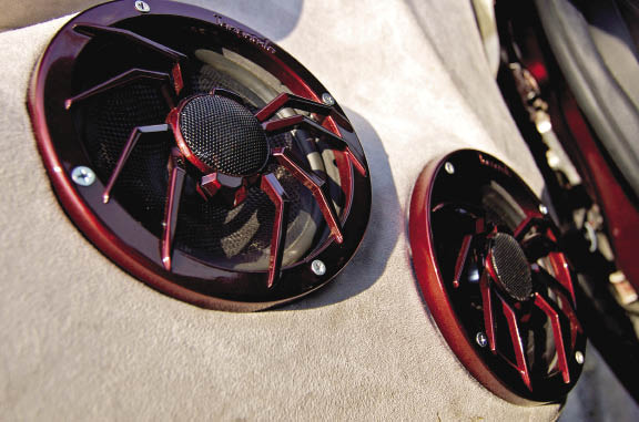 A pair of 7-inch Soundstream LCD screens have been placed in the trunk to relay video and entertainment. All of the wiring, fuses and distribution blocks are by Tsunami and the whole system is lit up by an Optima Red Top battery.
