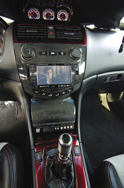 From the exterior, the car is difficult to identify as an Accord. An AIT Racing body kit was added that consists of a front and rear bumper and sideskirts, but the AIT treatment didn’t stop there. Sunny installed an AIT Racing carbon fiber hood, carbon fiber roof and roof spoiler. A Grillcraft upper and lower grille was added to give the front end a more aggressive look along with DEPO HID headlights and rear LED tails. The doors were also fitted with a Verticals Doors kit before M1 Autobody shot the whole project in House of Kolors candy black cherry paint.