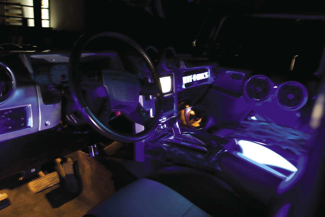 Each amp is pushing a Hifonics Olympus OLM2412 12-inch subwoofer with a striking blue light string around the circumference. Although they may look arbitrarily placed, make no mistake, this system pounds. Each of the doors houses its own illuminated Hifonics amps set into a custom fiber glassed skin. These individual amps are driving a quartet of Hifonics MX6 components in each of the doors, with more upfront amounting to 18 speakers in total. Supplying the juice are twin Kinetik 1800s mounted in a custom fiber glass rear console, with a matching battery under the hood. Hooker Audio supplied all of the 0 gauge wiring and distribution blocks fed by and Dual 250 Ohio alternator.