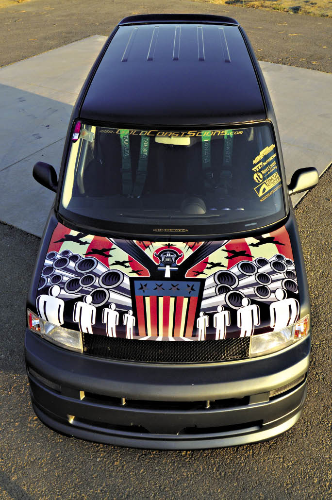 The inside of a Scion can be cozy, but Driscoll made it that much more intimate with a roll cage. The multi-point color-matched cage zips around the interior and renders the backseats useless making it a 2-seater.