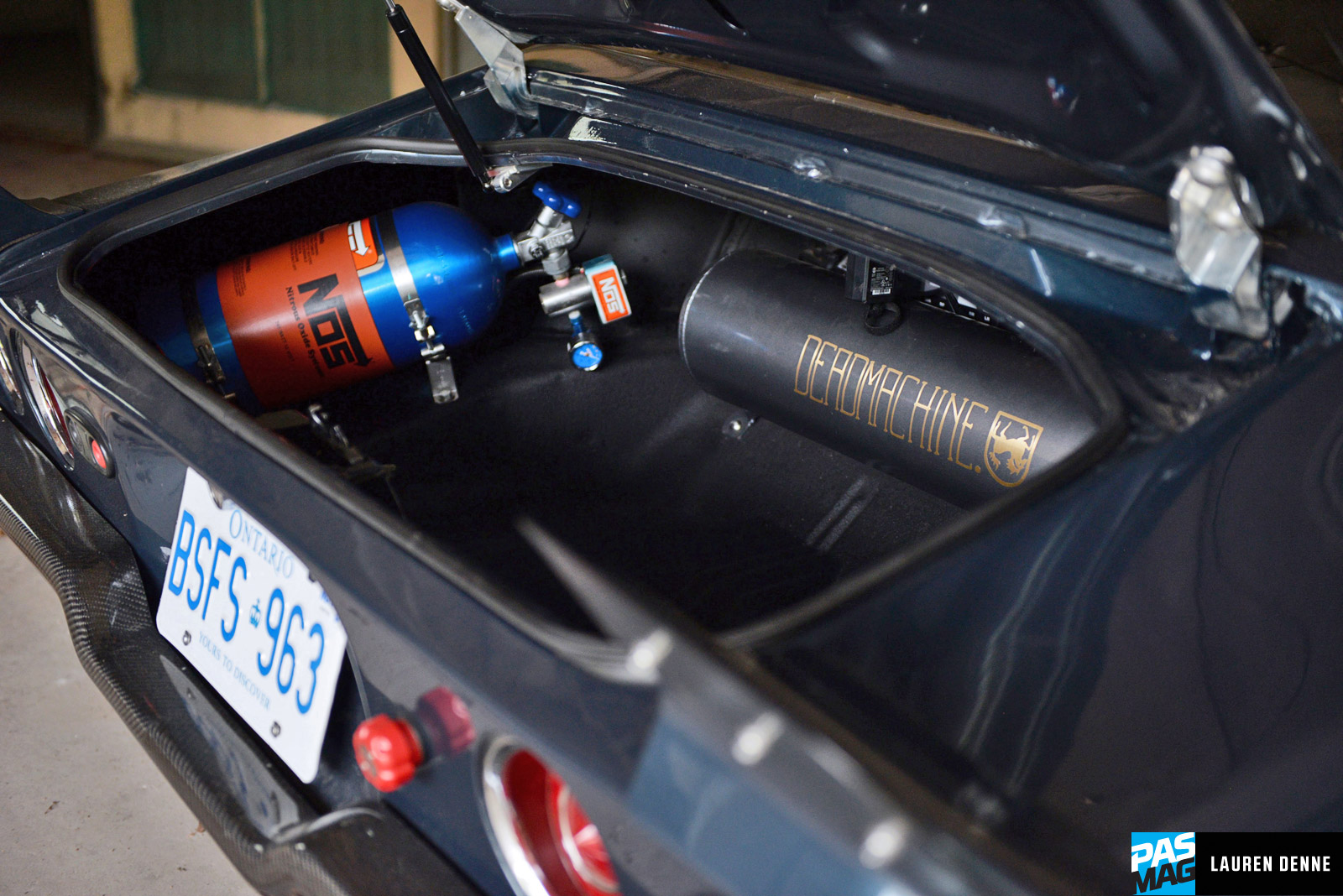 The modernized classic theme continues in the cockpit with a slew of custom touches and upgraded tech. Immediately noticeable is the integrated roll cage, custom built by the Cyrious boys. The gauge trim panel continues the carbon fiber diet theme we saw on the outside, and a an intricate Racepak IQ3 display dash serves as the primary source for information on the car’s performance at any given time. Most of the interior is met with a reupholstery of leather and alcantara in liberal doses, including a wrapped dash and center console. Sparco takes care of the driver with their Chrono seats, harnesses, and a full alcantara steering wheel that features both a 2-step button and a nitrous button for some extra jam in an instant, thanks to the Nitrous Outlet 200hp LSA wet-shot kit. Wait, what?
