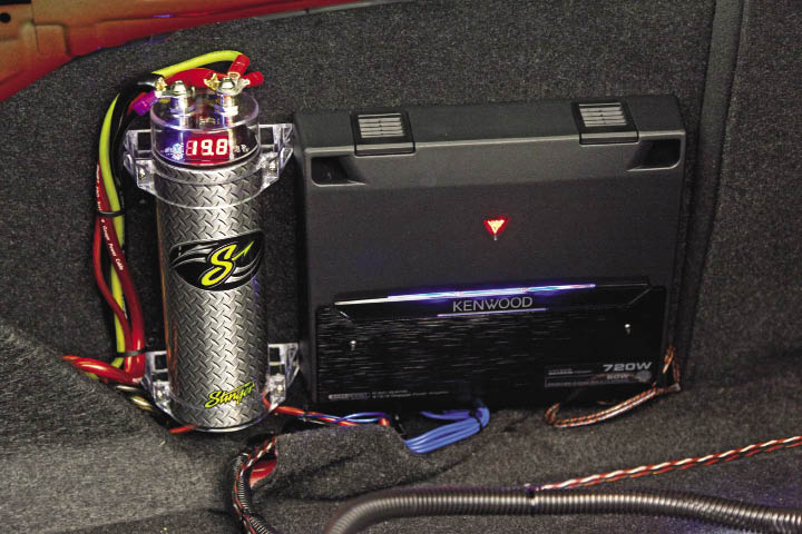 The amp and capacitor are mounted to the back of the rear seats. After prepping the 4-gauge power cable from the battery for capacitor connection using a ring connector, a ground connection is made using the same gauge cable and is connected to the cap. Running the corresponding power and ground cables, the amp is then connected to the RCA and remote cables. We can now connect the power at the battery.