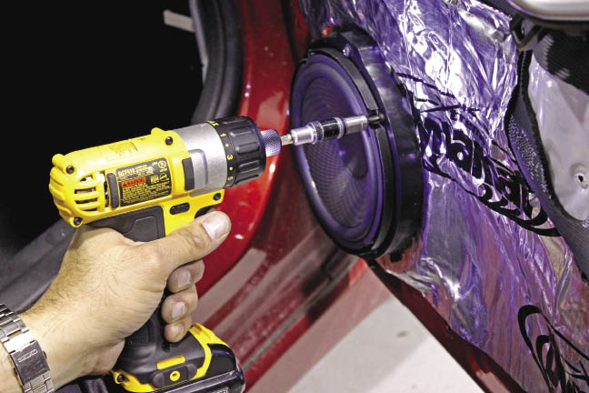 Next, the door panel is removed and the factory speaker is detached. Dynamat is used to insulate the speaker enclosure to prevent and control vibration. The new Kenwood KFC-P709PS speaker is rewired and screwed into place. The door panel is then replaced.