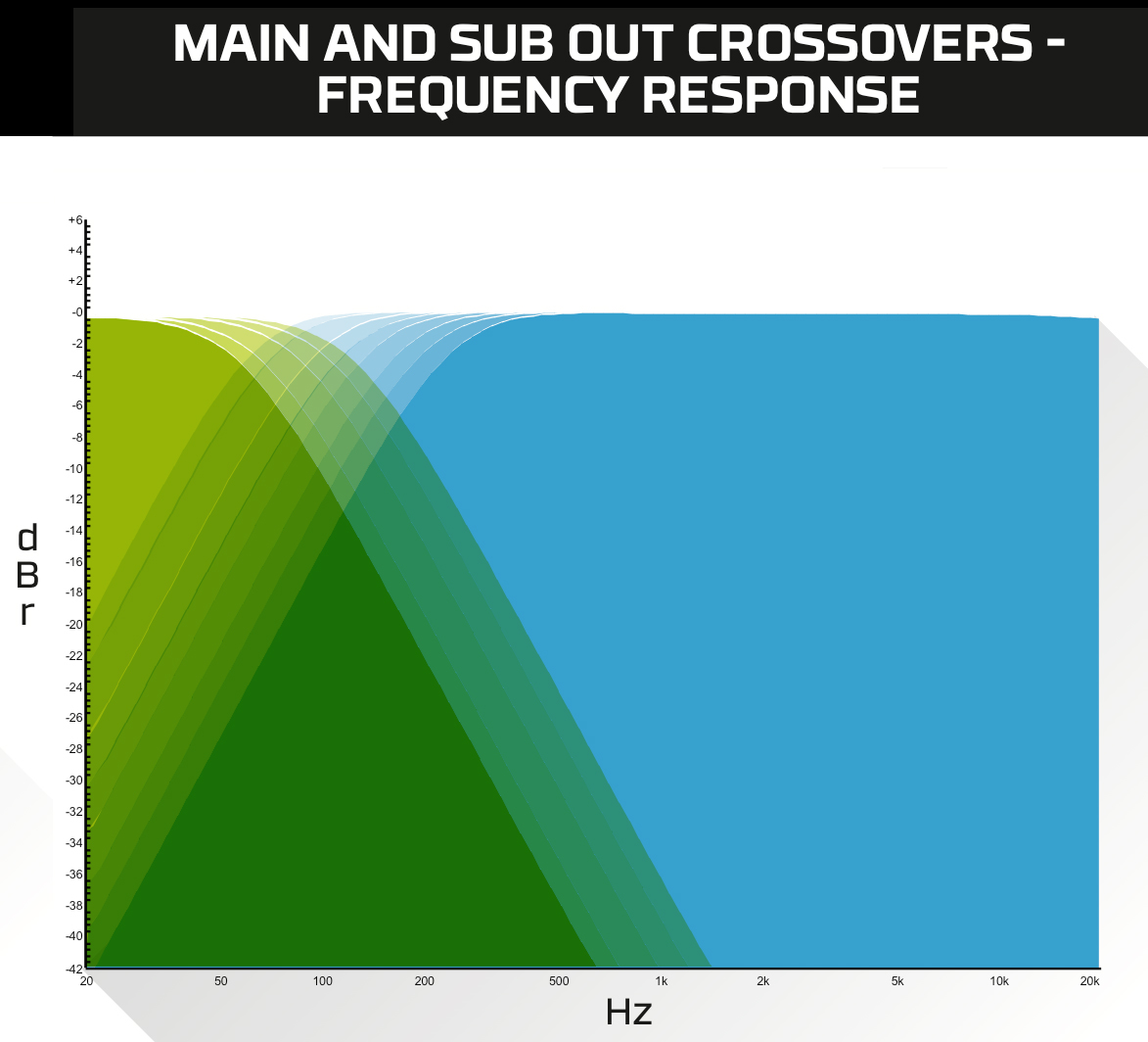 The subwoofer output comes with five low-pass frequency settings or an all-pass setting. In addition to the crossover frequency, the sub outs also have adjustments for phase and level.