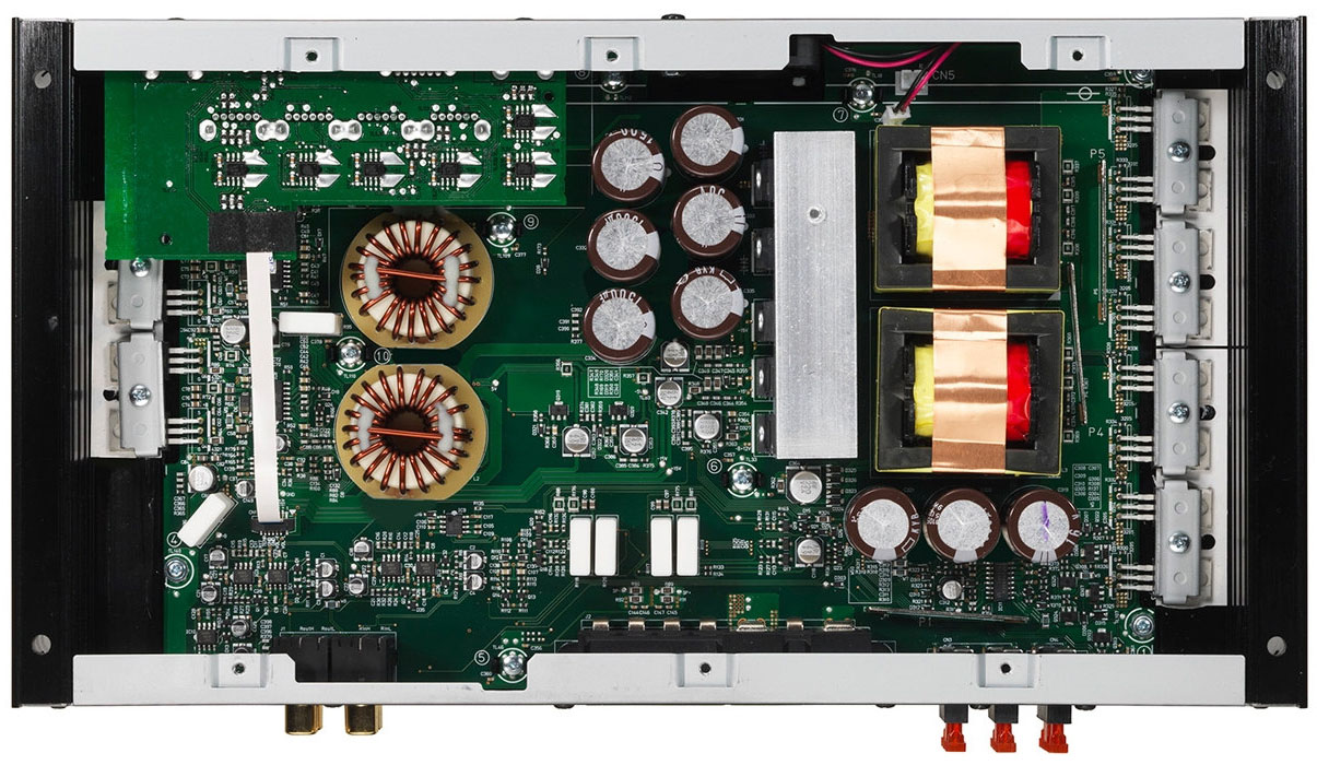 A quick look inside the amplifier confirmed the high density four-layer circuit board, and revealed extensive use of surface mount parts and other high quality components. The power supply uses eight high current MOSFET devices, and three 6800µF high speed capacitors for energy storage. The amplifier’s secondary capacitance is made up of six 1500µF caps, which feed four high current MOSFET output devices.